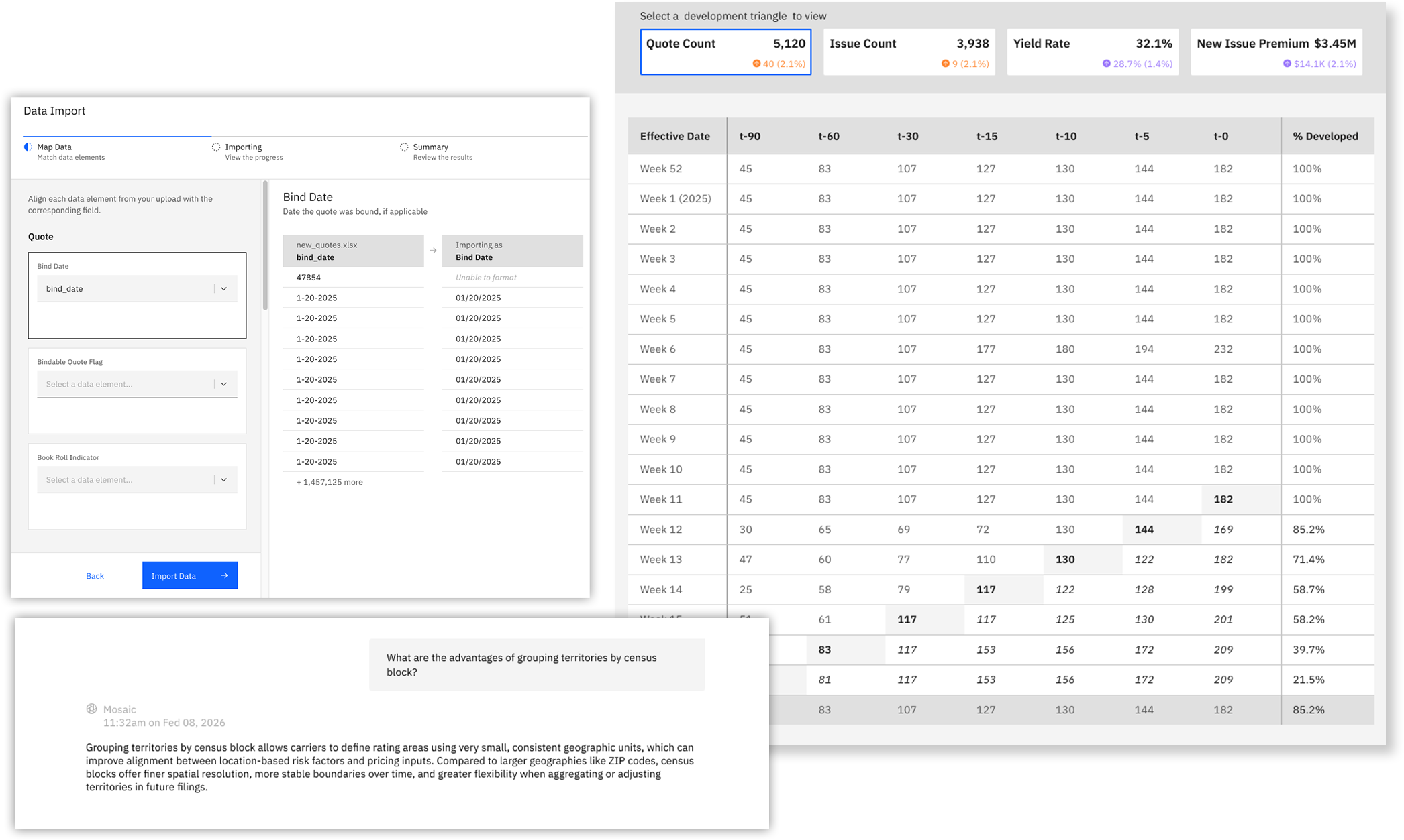 Tessera enables product managers to generate training data within the platform and train proprietary models on their own portfolio data, without building a separate data science function. The system preserves historical states, detects anomalies across time, and provides conversational access to structured, explainable insight. Unlike generic AI layered on top of data, Tessera builds insurance-native intelligence directly inside your environment.
